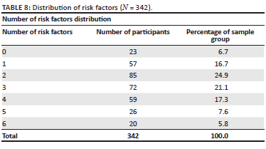The study revealed 23 participants (6.7%) did not display any of the identified risk factors, while those that had one risk factor accounted for 16.7% (n = 57). The majority of participants (24.9%; n = 85) had two risk factors, followed by 21.1% (n = 72) having three risk factors and 17.3% (n = 59) having four of the six risk factors. Those with five risk factors represented 7.6% (n = 26) of the sample group, with 5.8% (n = 20) displaying all six risk factors. Table 8 represents the risk factor distribution for the sample group.