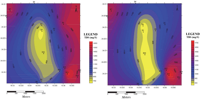 TDS spatial distribution of the pond water in (a) summer and (b) winter