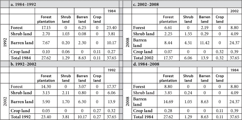 Matrices of land use changes (km2) between (a) 1984-1992; (b) 1992-2002; (c) 2002-2008; and (d) 1984-2008