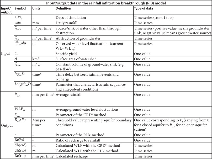 Input/output data in the rainfall infiltration breakthrough (RIB) model