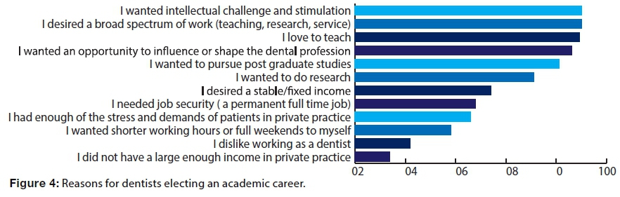 The reasons respondents chose an academic career were arranged in order of prevalence. The sequence was: a need for intellectual stimulation (90%), desiring a broad spectrum (service, teaching and research) of work (90%), having a love for teaching (89%), wanting to influence or shape the profession (86%), to pursue postgraduate studies (81%) and to undertake research (71%) (Figure 4).