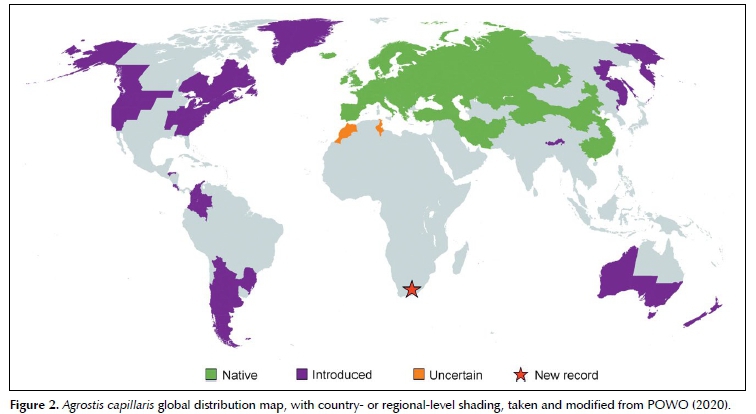 Notes: Agrostis capillaris is generally not considered invasive in the areas where it has been introduced and naturalised, and is not included in the IUCN Global Invasive Species Database (http://www.iucngisd.org/gisd/). Nevertheless, given the current perceived fragility of the alpine sub-centre of the DMC (Global Mechanism of the UNCCD 2018, 2019; Bentley et al. 2019; Carbutt 2019), the demographics and spatial extent of this species should be examined, and its behavior closely monitored (by e.g. the South African National Biodiversity Institute's (SANBI) Invasive Species Programme). The species was found to be locally frequent and occurs alongside Festuca rubra, also detailed in this paper, and may have been sown as a lawn mix by the Tiffindell Ski Resort to ensure adequate cover of their ski slopes. Other native species such as Lachnagrostis barbuligera (Stapf) Rugulo & A.M.Molina or Poa binata Nees, which were found in the vicinity, and are just as capable of forming a close sward, should rather be used in seeding projects as opposed to these non-native species.