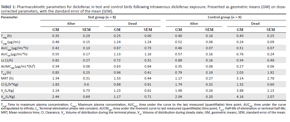 Blood samples were drawn from the wing veins of the birds using 21 gage (G) needles attached to preheparinised 3 mL syringes at 0.0 h, 0.25 h, 0.5 h, 1.0 h and 2.0 h after dosing. Samples were transferred into prelabelled plasma tubes and centrifuged within 1 h of sampling at 1660 × g and 25 °C for 15 min. Samples were split for uric acid and diclofenac analysis and were then stored at -80 °C. Scheduled and unscheduled deaths were submitted to the University of Pretoria Paraclinical Department, section of veterinary pathology, for full gross and histological evaluation. Where needed, samples were collected in 10% buffered formalin, sectioned and stained via haematoxylin & eosin (H&E) technique and subjected to histopathologic examination.