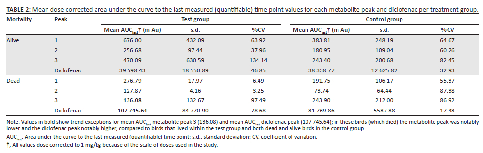 When evaluating metabolite peak AUClast values, there was no statistically significant relationship between the extent of metabolite exposure and mortality nor between dose and metabolite production. There was also no statistically significant difference in exposure between treatment groups. When comparing the two treatment groups (both dead and alive birds), the test birds produced higher AUClast metabolite values compared to the control birds (Table 2). The exception to this was peak 3 in the birds that died, which was notably lower in the test birds (value in bold in Table 2). The mean dose-corrected diclofenac peak AUClast reading was also considerably higher in the dead birds (value in bold in Table 2). A different picture was present when comparing birds that died with those that survived across both treatment groups (Table 2); the birds that died produced lower AUClast metabolite values for all three metabolite peaks across both groups. The exception was peak 3, where the mean AUClast values were almost identical between dead and alive birds within the control group.