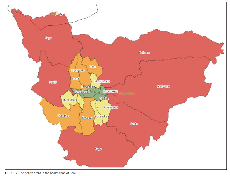 This study was conducted throughout the town of Beni, which corresponds to the urban health zone of Beni. It has a population of 474 236 inhabitants spread over a geographical area with an average density of 386 inhabitants/km2. This health zone is divided into 18 health areas (HAs) (Figure 2) and includes 306 healthcare structures, including 1 general reference hospital, 3 hospital centres and 18 health centres.