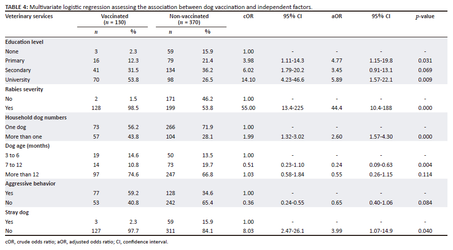 The vaccinated dogs were associated with certain animal characteristics (Table 3): the ownership of more than one dog, the non-aggressive behaviour, guard or companion dog (non-hunting use) and dog bred in confinement (no straying dog).