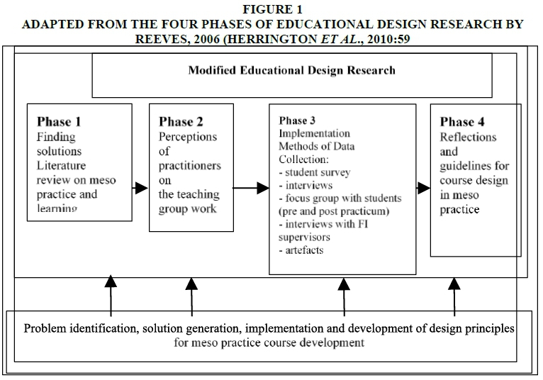 EDR occurs in the real world, with real people who live complex lives (Teras & Herrington, 2014). A significant limitation of EDR is the long-term phased engagement and refinement of the process, which can take between two and five years (McKenney & Reeves, 2012; Reeves, Herrington & Oliver, 2005). EDR can be confused with action research, where educators "study their own teaching practice to solve personal challenges in the classroom" (Reeves et al., 2005: 107). However, the difference between action research and EDR is the use of design knowledge and theory to develop design principles accessible to other educators, which can be used to solve practical problems in the classroom (Reeves et al., 2005:107). This article attempts to show practical workable solutions derived through EDR, by paying careful attention to the views of practitioners, and by understanding the problem from their perspective. In this way, praxis is foregrounded through analysis of practical problems encountered by practitioners regarding the way they teach and supervise students in group work.