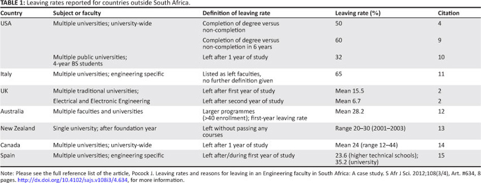 Although Tinto's6 figure for leaving of 44% was from the 1970s, a review of current literature suggests that little has changed in terms of the number of students retained. Table 1 gives an indication of more current leaving rates reported for the USA, Canada, Europe, the UK and Australasia. In cases where data specific to Engineering faculties have been given, these are reported rather than overall rates. As can be seen, overall non-completion rates of 50% - 65% are still reported for 4-year degrees and Engineering degrees, with first-year leaving rates of 15% - 35% reported in a range of subjects including Engineering. In South Africa, lower rates of 27% - 40% for Engineering degrees are reported, as shown in Table 2.