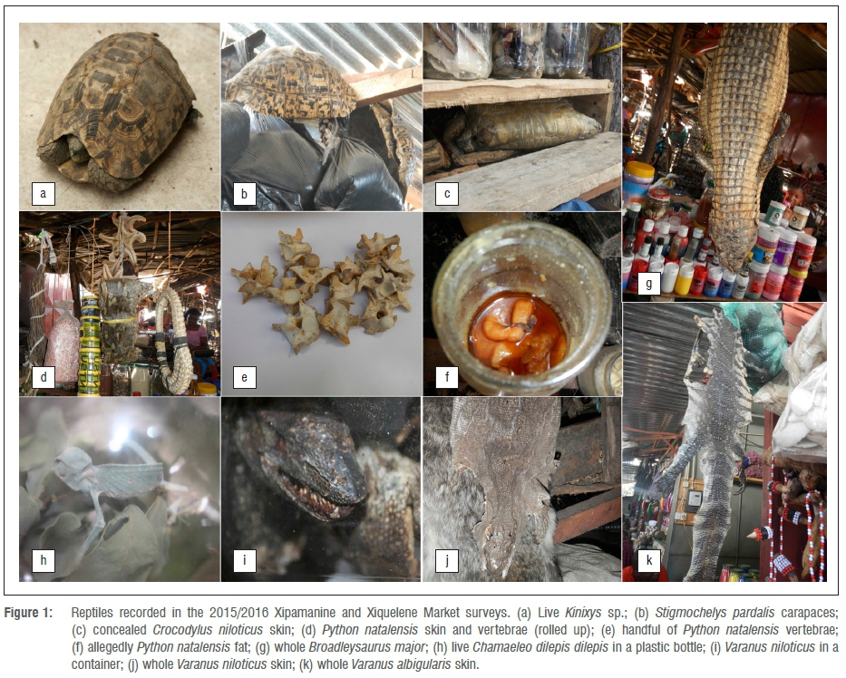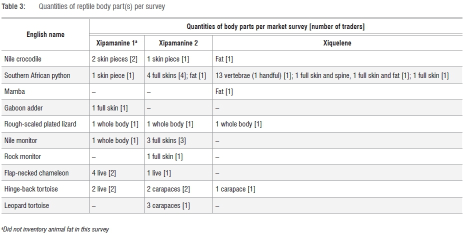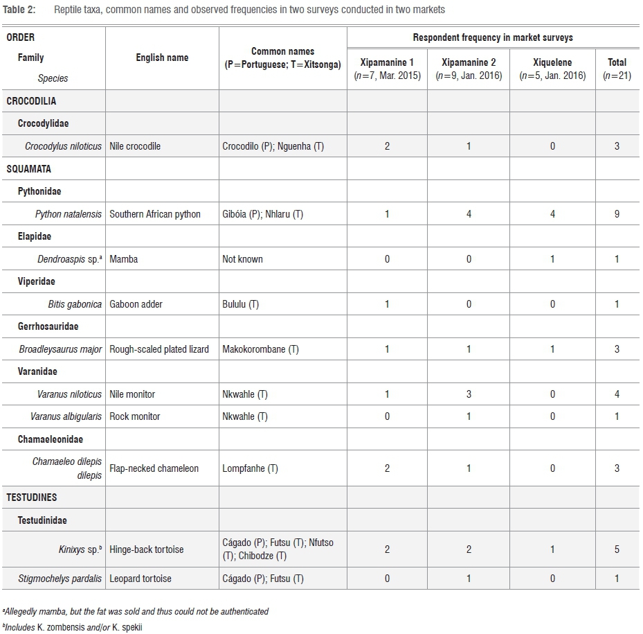 An interpreter from Eduardo Mondlane University (Maputo), trained in interviewing techniques, assisted with the interviews. A semi-structured questionnaire (see Appendix 1 in the supplementary material) was used that was verbally translated into Portuguese and Xitsonga - the most commonly spoken languages in Maputo - by the interpreter during the interviews. The questionnaire consisted of three parts: (1) basic trader information (sex; whether traders were traditional healers or not; a participant code for anonymity); (2) market information (species preferences by traders and customers; how reptiles reach the market); and (3) species information (taxon sold; common names; parts sold; geographical harvesting origin; availability; uses; etc.) (see Appendix 1 in the supplementary material). The information was supplemented by informal discussions. All reptiles, except those that were easily identified, were photographed where consent was given and later identified to species level using the taxonomic arrangement of Bates et al.18 and Uetz and Hosek19.
