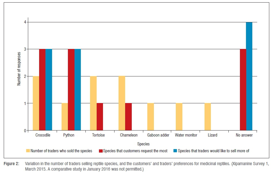 It is clear that traditional healers are the primary, if not sole, purchasers of reptile-based medicines in the markets. Crocodile and python were cited in the 2015 survey as the species that healers request most often, and also the species the traders would prefer to sell if they could acquire the stock (Figure 2) (note: these questions were deleted on request in the 2016 survey). Chameleons and tortoises were also mentioned as species that are in demand (although less often than crocodiles and pythons, and perhaps the reason for keeping them alive).