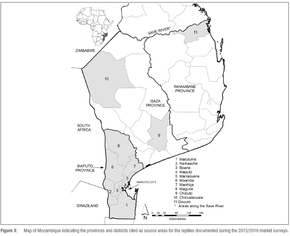 With these caveats in mind, our findings suggest that trade of reptiles via the markets in Maputo is unlikely to have any significant conservation consequences for the species concerned. However, we believe that the ethnoherpetological trade between Mozambique and South Africa is active, especially to the large urban traditional medicine markets in Johannesburg and Durban where there are more than 60 traders (some of them Mozambican) in each market selling animal products. Consequently, it is likely that, while the domestic market in Maputo is quite small, consumption in the rural areas and the international trade are having a larger impact and that warrants further investigation, possibly from the South African end of the supply chain.