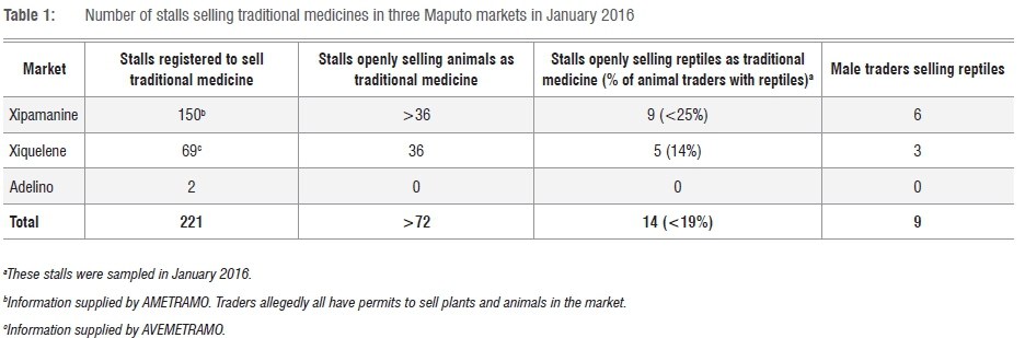 Based on the available market information, we undertook our first market survey in Xipamanine in March 2015 with seven traders. We had intended to conduct a comparative study in South Africa in 2015 (specifically in Faraday Market in Johannesburg and Warwick Market in Durban), but the Chairpersons of these markets denied permission for the study. Hence we limited the trade study to Maputo and followed up with a second survey conducted there in January 2016, this time in two of the three markets and including all 14 traders that sold reptiles as traditional medicine in the study (Table 1).
