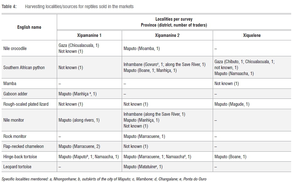 Most specimens were collected from districts within Maputo Province (Table 4), but python, crocodile and the Nile monitor were also acquired from the adjacent provinces of Gaza and Inhambane (particularly along the Save River in northern Inhambane). The Chicualacuala District in Gaza is approximately 430 km from Xipamanine and was noted by Chauqúe5 to be a major supply area for all animals sold in Maputo markets - probably because of the high faunal diversity in the region and its proximity to the Greater Limpopo Transfrontier Park. However, Krog et al.7 also noted that most traders (of medicinal plants) interviewed in Maputo markets originally came from the neighbouring provinces of Gaza and Inhambane before becoming permanent traders at the market, and that the majority of plant products was acquired from these two provinces and Maputo. Although we did not record the respondents' ethnic group, Chauqúe5 further reported that Mashope vendors (Chopi-speaking and originating from northern Gaza and southern Inhambane) were the second-most common ethnic group of the animal traders. Therefore, links to 'home' and familial ethnic ties to certain rural areas may also function as important harvesting conduits for acquiring species.