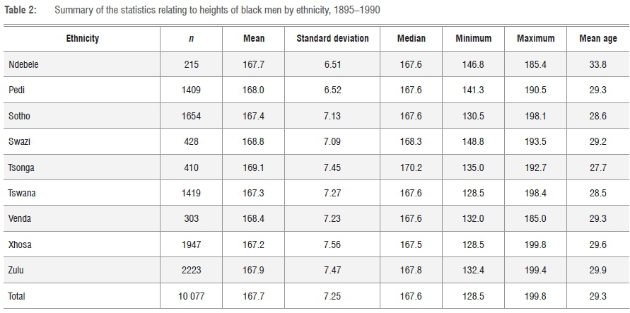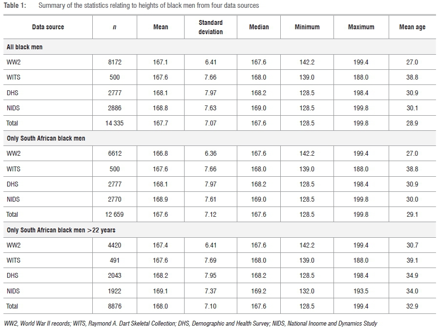Our second source was the Raymond A. Dart Collection of Human Skeletons at the University of the Witwatersrand, derived from 2605 bodies that were otherwise unclaimed from regional (southern African) hospitals. Most (76%) of the skeletons are of black southern Africans, and most (71%) are male individuals.16 Although most of the men died between the ages of 20 and 70 - the reason for death is often included -we limited the sample to 500 skeletal measures describing men between the ages of 18 and 50 years. The WITS collection is not demographically representative, but it has the advantage of identifying ethnicity, place of birth and cause of death recorded over an extended time span.16 Although this sample is small, it shows no evidence of truncation at either side of the distribution. The mean and standard deviation of height are similar to that of the NIDS data, which are nationally representative.