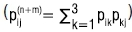 estimates the probability of leaving state i for state j in n+m steps, pik is the probability of being in state i in n steps, pkj is the probability of being in state j in m steps, for i = 1, 2, 3; j = 1, 2, 3; k = 1, 2, 3. Let 1 = employed (E), 2 = unemployed (U) and 3 = inactivity (I).