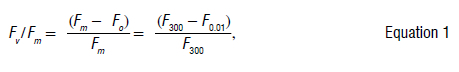 The most commonly used chl fluorescence measuring parameter is F/Fm37, with the dark-adapted value of FJFm signifying the maximum potential quantum efficiency of PSII in plants if all capable reaction centres were open.38