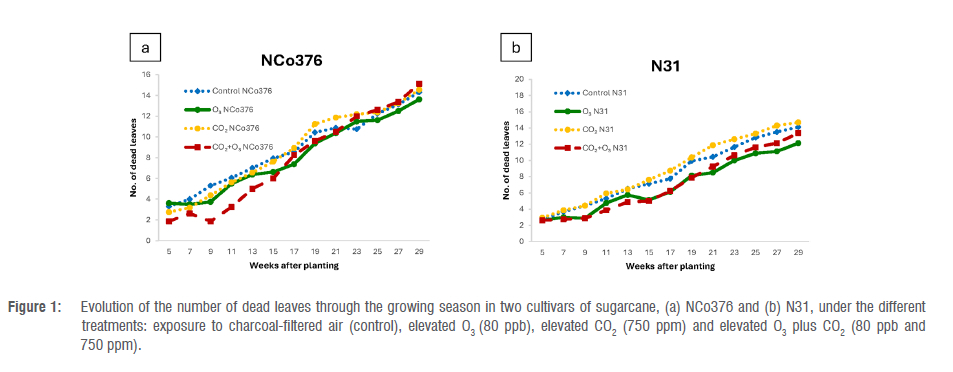 • This article adds to the existing literature on sugarcane and ozone (O3). We present a pilot study for two cultivars of sugarcane and explore interacting effects of O3 and carbon dioxide (CO2) on various stress and crop quality indicators.