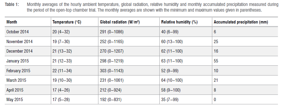 Near-site meteorological data for the period of the trial were obtained from the Welgegund Atmospheric Research Station (http://www.welgegund.org), which is located at 26.57°S and 26.94°E with an elevation of 1480 m above sea level. The highest temperatures and relative humidities occurred during summer (December, January and February), with global radiation being the highest during spring (September, October and November) and summer (Table 1). Rainfall occurred predominantly from November to March. A comparison of ambient temperature and relative humidity levels with measurements taken inside the OTCs indicated that the temperature and relative humidity were higher (by 2-5 °C and 10-20%, respectively) inside the chambers compared with the outside. Additional data obtained from the station were ambient O3 concentrations that were used to calculate AOT40 values (Supplementary figure 1).