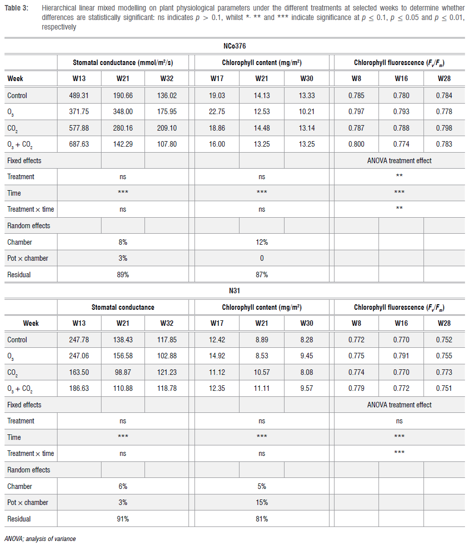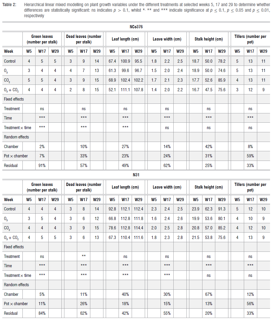 HLMs were used in this study to statistically evaluate the influence of various parameters, i.e. pots, chambers, treatments and time effects, and to determine whether there is a statistically significant difference between 'treatment' and 'time', as well as the interaction of 'treatment' over 'time'. The analysis indicates that the factor that most influenced the growth and physiological response of each variety was 'time', whilst 'treatment' was only significant in predicting the dead leaves in the N31 cultivar. The 'chamber' effect influenced the variation in leaf length, leaf width and stalk height in the N31 variety, whilst affecting stalk height in the NCo376 variety. The 'pot' level also explains some amount of variation in the growth variables, particularly in 'tillers' for both cultivars. However, neither the 'chamber' nor 'pot' level contributed significantly to variations in stomatal conductance and chl content. As given by the residuals in the statistical analysis (statistical variation that could not be accounted for), over 80% of the variation was unexplained in the stomatal conductance and chl content data. For chl a fluorescence, the 'treatment' effect was significant for NCo376, with increased O3 exposure decreasing the F/Fm vratio whilst elevated CO2 increased F/Fm. A reduction in the F/Fm values indicate damage to the PSII II photosynthetic machinery.