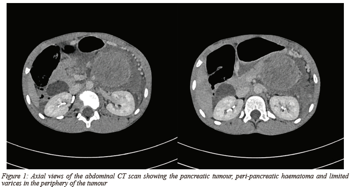 After administering intravenous fluids and analgesia, a CT scan was performed. The scan showed a significant amount of perisplenic free fluid with a heterogeneous soft tissue mass in the tail of the pancreas measuring 64 mm AP x 73 mm TV x 75 mm CC (Figure 1). The mass displaced the bowel and stomach and was associated with a predominantly left retroperitoneal haematoma extending into the pelvis. The splenic artery was displaced superiorly by the mass. Although the splenic vein was poorly visualised numerous coronary collateral vessels could be seen in addition to gastro-oesophageal varices along the greater curvature of the stomach. There was no involvement of the liver, gallbladder, spleen, kidneys, stomach, or small or large bowel.