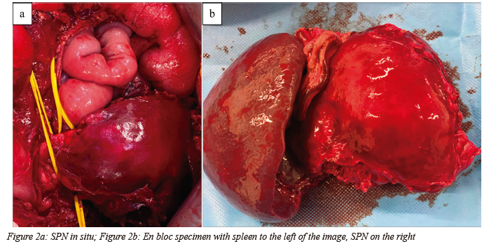 At laparotomy, minimal blood was present in the peritoneal cavity and around the pancreas, matching the CT scan findings. The pancreatic mass was not ruptured macroscopically. A distal pancreatectomy with en bloc splenectomy was performed with an uneventful postoperative course (Figures 2a and b).