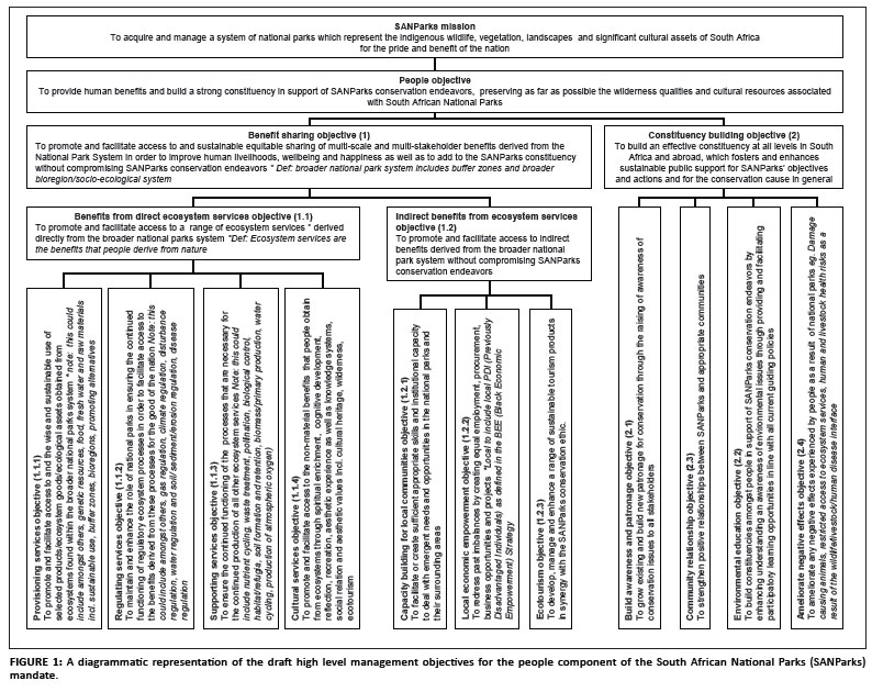 Although the above process has been well articulated within the biophysical realm of SANParks, numerous challenges exist when it comes to its effective implementation. Similarly, implementing SAM for the social components of protected areas comes with its own set of challenges and, if it is to be applied effectively, requires an understanding of some specific concepts. We need to acknowledge that protected areas are nested in a mosaic of land uses and it is necessary to appreciate the role that they play in the broader system if we are to understand which drivers support and which drivers threaten their existence or constrain their goals. Having a complete understanding of these factors is nearly impossible owing to their complex, dynamic and unpredictable nature. Our management strategies and approach to thinking around these issues need to accommodate this incomplete knowledge by being flexible and adaptable to change as our knowledge and understanding of the system grows. Protected areas are nested in a system that supports people through a large variety of ecosystem services or benefits that people derive from nature (Scholes & Biggs 2004). The accessibility of these services to people living within the system has a direct bearing on human livelihoods and well-being (Scholes & Biggs 2004), with a reduced available supply of services resulting in increased household vulnerability to risks and shock events (Parent 2010; Scholes & Biggs 2004). Although SANParks strives to reduce household vulnerability through promoting access to ecosystem services that will have positive effects on livelihoods and well-being, this has only been articulated in a very broad way and not embedded explicitly in much of what the SE and, more recently, the P&C has been trying to accomplish. The need for a strategic plan and conceptual framework for benefit sharing and constituency building has long been identified as a priority (Pollard 2003) and these specific objectives have been articulated systematically only recently in the form of a 'people objectives hierarchy' across SANParks (Figure 1) (SANParks 2010a).
