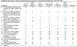 Furthermore, as is evident from Appendix A, most of the participants reported that they rarely or never interacted with NS of English (Items b-f in Appendix A), read newspapers (Item i) and books in English (Item j), listened to English programmes on the radio (Item k), or watched TV news in English (Item g). The only activities in which they engaged relatively often were listening to English songs (Item l), surfing English websites on the internet (Item m), and watching movies and English TV channels (Items h and a). The findings of this study were consistent with the results of a study conducted by Hatipoğlu (2009:347) who also found that the majority of pre-service EFL teachers in Turkey "never have face-to-face conversations with, or write to or receive e-mails from native speakers" of English.