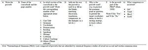The reference list including the most known/commonly used proverbs in oral and written interactions in a language is known as the "paremiological minimum" (Mieder, 2004). The paremiological minimum forms part of the cultural literacy of NS and is very important for FL instruction (Mieder, 2004). Considering the English language, a precise paremiological minimum is not known, but Haas (2008) established a descriptive paremiological minimum for English. She asked college students from four regions in the USA to complete proverb generation and proverb familiarity tasks and found that proverb familiarity was stable across the studied regions. The list of proverbs derived at the end of her study is called the "descriptive paremiological minimum" (Haas, 2008:328). Haas's (2008) list was used for the analysis of the proverbs in this study. Proverbs were classified as shown in Table 1 and noted in the analysis form.