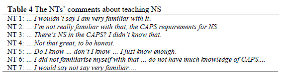 The NTs' comments reflected their lack of familiarity with and comprehension of the NS content as stipulated in the CAPS (DBE, RSA, 2011:8). A comprehensive analysis of the NTs' statements (see Table 5), highlights a common theme of knowledge gaps, feelings of uncertainty and inadequacy (NTs 1, 2, 3, 4, 5, 6 and 7). The findings are concerning, especially in the light of the professional expectations prescribed in the Norms and Standards (Department of Education [DoE], RSA, 2000:15). The norms and standards document advocates a strong foundation in the knowledge, skills and principles relevant to the subject. In this study, the observed lack of sufficient CK among the NTs resonates with Shulman's (1986:6) notion of the "missing paradigm", highlighting its indispensable role in enabling effective teaching and learning. Shulman (2004) emphasises the importance of teachers' CK for their teaching practice. The NTs' insufficient CK not only hampered their own knowledge base but also impacted their ability to effectively interpret, understand and implement CAPS NS content during instruction.