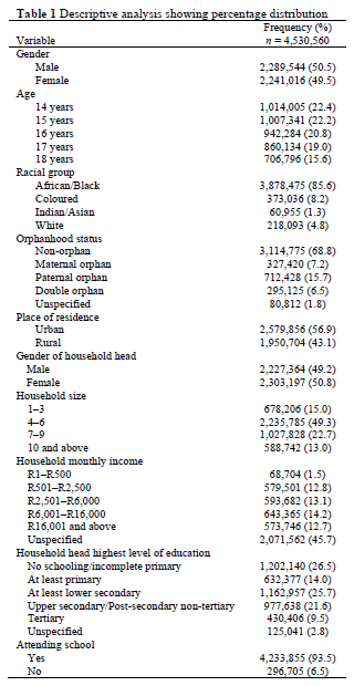 The South African population is composed of four racial groups - Black, Coloured, Indian/Asian, and White (Statistics South Africa, 2019b). Before 1994, the South African education system was racially segregated. Non-white schools experienced systematic deprivation in terms of essential teaching and learning resources (Sibanda, 2001). At the advent of the democratic regime in 1994, schools and departments of education became deracialised and unified (Spaull, 2015). Over these years, school attendance at the primary school level has become almost universal (99%). However, school attendance at the secondary school level is not yet universal. In addition, for those aged 16 to 18 years, which is the official age group for upper secondary education, the attendance rate has not exceeded 86% (Department of Basic Education [DBE], Republic of South Africa [RSA], 2018). Research has shown that adolescents who are not in school are at higher risk of engaging in unprotected sex, unplanned pregnancies, and being infected with the human immunodeficiency virus (HIV) (Kattan & Székely, 2015; National Department of Health, Statistics South Africa, South African Medical Research Council & ICF, 2019; Stoner, Pettifora, Edwards, Aiello, Halpern, Julien, Selin, Twine, Hughes, Wang, Agyei, Gomez-Olive, Wagner, MacPhail & Kahn, 2017). Therefore, higher levels of secondary school attendance will help to check the high prevalence of HIV in the country when schools are used as an effective platform for disseminating reproductive health education. To combat poverty and generate a substantial human capital boost for the economy, one must look beyond primary education. Attending and finishing secondary education will create the leverage for people to acquire the knowledge and skills to escape poverty (Lutz, Crespo Cuaresma & Sanderson, 2008; World Bank, 2018). It will also enable adolescents to pursue higher education, access better economic opportunities, and reach their full potential. Hence, understanding the factors associated with secondary school attendance in South Africa will inform the development of strategies that will improve school participation, combat poverty, and advance the economy. Historically, students' refusal to attend school can be predominantly attributed to lack of funds for their tuition (DBE, RSA, 2018). With this article, we extend knowledge by investigating the association between learners and their household characteristics with school attendance. We provide a general review of some socio-demographic variables affecting school attendance among secondary school-age learners in South Africa. We explain how much their sociodemographic characteristics affect schooling. Furthermore, we reveal the level of secondary school participation based on learners' racial groups, which is a topical issue within the South African context.