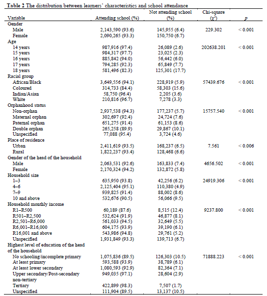 The aim with this study was to investigate the individual and household factors associated with school attendance among secondary school-aged learners in South Africa. The study revealed that about a quarter of all the learners' heads of households had not completed primary education. Age as an individual-level characteristic and educational attainment of learners' heads of households as household-level characteristic were the most important factors associated with school attendance in this study. In the South African population, gender and urban/rural place of residence do not have a great effect on school attendance. Learners belonging to the Coloured racial group were the most disadvantaged with regard to school attendance. School attendance levels decrease as adolescents grow older (UNESCO, 2020). The educational background of a learner is also an inspiring factor for school attendance. Taking measures to ensure that learners start attending school on time and transit progressively through higher grades is recommended. Learners from poor backgrounds, large households, orphans, and Coloureds should be provided with additional educational support. Mobilising resources to ensure that the current population of learners attend and complete school will bring about future rewards.
