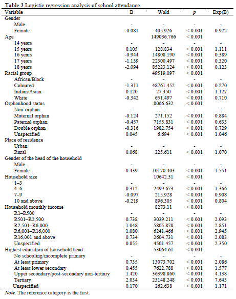 Table 2 displays the distribution between school attendance and learners' characteristics and household characteristics. The study results indicate that there was a very narrow gap in the level of school attendance for boys and girls (93.6%, n = 2,143,590; and 93.3%, n = 2,090,265) respectively. The Chi-square test indicates that school attendance is associated with gender. This means that school attendance differed significantly between boys and girls (χ2 = 229.302; p < 0.001). For the age of learners, secondary school attendance was fairly the same for learners aged 14 and 15 years (97.4%, n = 987,916; and 97.7% n = 984,317 respectively), yet school attendance declined among learners aged 18 years with 82% (n = 581,496) attending. The Chi-square results reveal an association between the age of learners and school attendance (χ2 = 202638.201; p < 0.001). This means that school attendance decreases significantly as learners advance in age. Considering the racial group, the findings reveal that Coloured learners had the lowest level of school attendance (84.4%; n = 314,733), while White learners had the highest level of school attendance (96.7%; n = 210,816). The Chi-square test indicates that there was a significant relationship between the racial group and school attendance for the learners (χ2 = 57439.676; p < 0.001). This implies that the racial group of learners affects school attendance. There was a significant association between orphanhood status and school attendance (χ2 = 15757.540; p < 0.001). Learners who had lost one or both parents had lower levels of school attendance. Further results indicated that the level of school attendance for learners residing in urban areas was not much different from that of their counterparts in rural areas (93.5%, n = 2,411,619; and 93.4%, n = 1,822,237 respectively). There was an association between learners' place of residence and school attendance (χ2 = 7.561; p < 0.006), which implies that learners' school attendance depends on whether they live in rural or urban areas. Furthermore, learners in households headed by females had a significantly higher level of school attendance than those in households headed by males (94.2%, n = 2,170,324; and 92.6%, n = 2,063,531 respectively). In this regard, the Chi-square test indicates that there was a significant relationship between the gender of learners' household heads and school attendance (χ2 = 4656.502; p < 0.001). Hence it shows that learners from female-headed households attended school more than those from male-headed households. Further findings indicate that school attendance among learners decreased significantly as household size increased, as shown by the Chi-square test (χ2 = 24919.306; p < 0.001). This means that learners are more likely to attend school when the household is smaller. This implies that the educational needs of learners are better provided for when the household consists of fewer members. This study also shows that learners from households with a monthly income of R500 and less had the lowest level of school attendance (87.6%; n = 60,189), while learners from households with a higher income of R16,001 and above (94.8%; n = 543,986) had the highest level of school attendance. When households do not have a decent income, they will not be able to provide financial support to their household members, which in turn affects the school attendance of the household members. Hence, the Chi-square test indicates a significant relationship between households' income and school attendance (χ2 = 9237.800; p < 0.001) of learners from those households. Furthermore, the study reveals that when learners' household heads had attained tertiary education, school attendance peaked at 98.3% (n = 422,899), while for those with little or no schooling it was at 89.5%, (n = 1,075,836). The Chi-square test indicates a significant relationship between school attendance and the level of education for the heads of the learners' households (χ2 = 71888.223; p < 0.001). This means that learners from a well-educated background attend school more than those from a less-educated background.