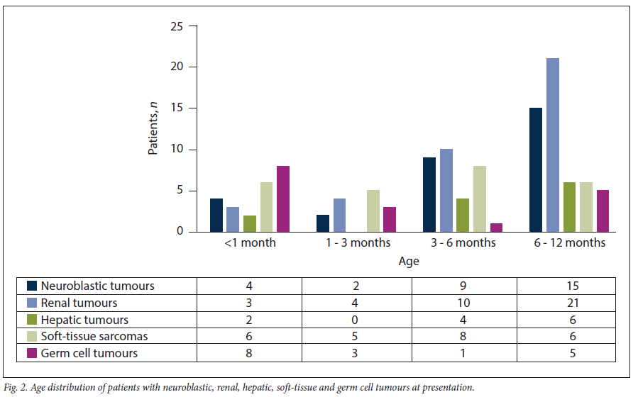 In terms of incidence, most publications on this age group place neuroblastoma first, followed by renal tumours, with regional differences between germ cell tumours, soft-tissue sarcomas and liver tumoursI5·9·14- 5!However, in a large series of infantile solid tumours by Jin et al[24] published in 2020, grouping 6 Beijing centres, hepatoblastomas were largely more represented than nephroblastomas. This would be explained by recruitment bias, as described by the authors.[24] On the contrary, in our series, renal tumours are in first position, followed by neuroblastic tumours, then soft-tissue sarcomas, germ cell tumours, and finally liver tumours. This finding is consistent with the results of the report by Erdmann et al.[26] on the incidence of childhood cancer in SA, except for liver tumours, which precede germ cell tumours. The position of neuroblastoma in second place behind renal tumours in terms of incidence in these results, in all paediatric age groups including children aged < 1 year, may be specific to SA. It is also interesting to note that in the study by Schickerling and Mackinnon,[27] over a 25-year period at Chris Hani Baragwanath Academic Hospital, SA, and including only children aged <3 months, the order of incidence was also different, with soft-tissue sarcoma at the forefront of malignant tumours, followed by neuroblastoma. However, if the CMNs are included, which they classified as benign tumours, the renal tumours come before the neuroblastomas, which also corresponds with our findings.