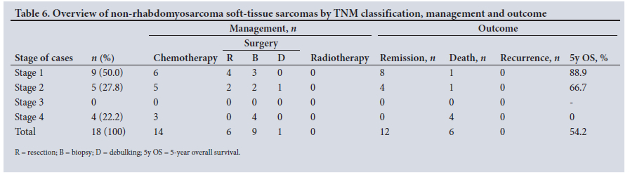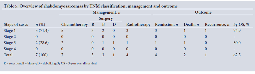 Of the 7 RMSs, 4 (57.1%) were embryonic, 2 (28.6%) were alveolar and 1 (14.3%) was botryoid. The most frequent anatomical site was the head, with 6 cases. The other site was the bladder. None of the children had metastatic disease at presentation. Table 5 shows the pre-treatment stage, management and outcomes of patients with RMS. The TNM classification[21] was 5 (71.4%) stage 1 and 2 (28.6%) stage 3. The 2 stage 3 tumours measured >5 cm. One was located in the bladder and the other was parameningeal, both of which are unfavourable locations. All the children received neoadjuvant chemotherapy and surgery (3 biopsies, 3 excisions and 1 debulking), while only 4 received radiotherapy. There were no notable complications. The median duration of follow-up was 59 (range 5 - 170) months, and outcome analysis showed 4 remissions (57.1%), 2 deaths (28.6%) and 1 recurrence (14.3%). Regarding the causes of the 2 deaths, the patient with stage 3 disease showed progression on treatment and the patient with stage 1 disease showed progression on metronomic treatment for relapse. For the 7 patients with RMSs, the estimated 5-year overall survival was 62.5%.