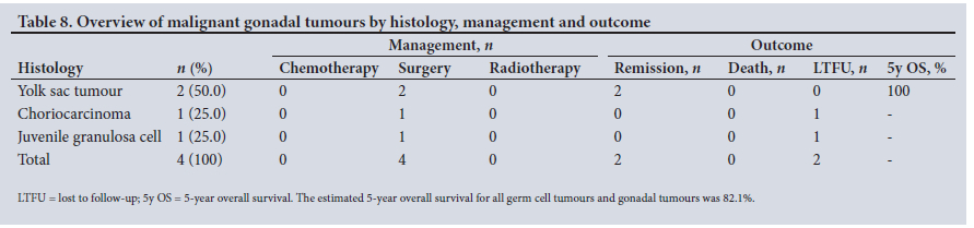 The 4 malignant gonadal tumours involved 2 left testicles and 2 ovaries, 1 right and 1 left. Both testicular tumours were YST stage 1[23] with increased AFP. The ovarian tumours were also stage 1,[23] and were a choriocarcinoma and a juvenile granulosa cell tumour. Tumour marker measurement were absent in both cases. None of the patients was syndromic. Table 8 shows the histology, management and outcomes of these patients. All 4 children were treated with surgery only, with no chemotherapy or radiotherapy. No notable complications were described. The 2 children with ovarian tumours were LTFU. The 2 children with testicular YSTs were in remission after 39 and 63 months of follow-up.