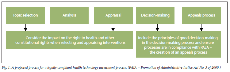 A handful of studies have included consideration of the legal dimensions of an HTA, and these recognise that the legal issues that arise in HTA are both significant and context-specific.[7-9] When an HTA body makes a decision, it is susceptible to being reviewed and even set aside by a court. This has meant that, in some countries, priority-setting and allocation decisions taken by HTA bodies and governments have been challenged and set aside through legal action. This poses significant risks to the feasibility and budget allocation process as, in some cases, governments have been forced to budget the funding of expensive drugs and technologies, resulting in less funding available for other essential services.[10,11] For this reason, the standard HTA process should be adapted to include three legal dimensions: the consideration of constitutional rights; the principles of good decision-making; and the procedural requirements of the Promotion of Administrative Justice Act[12] (PAJA), which are added to the standard HTA process in Fig. 1. Each of these additions will be discussed in further detail.