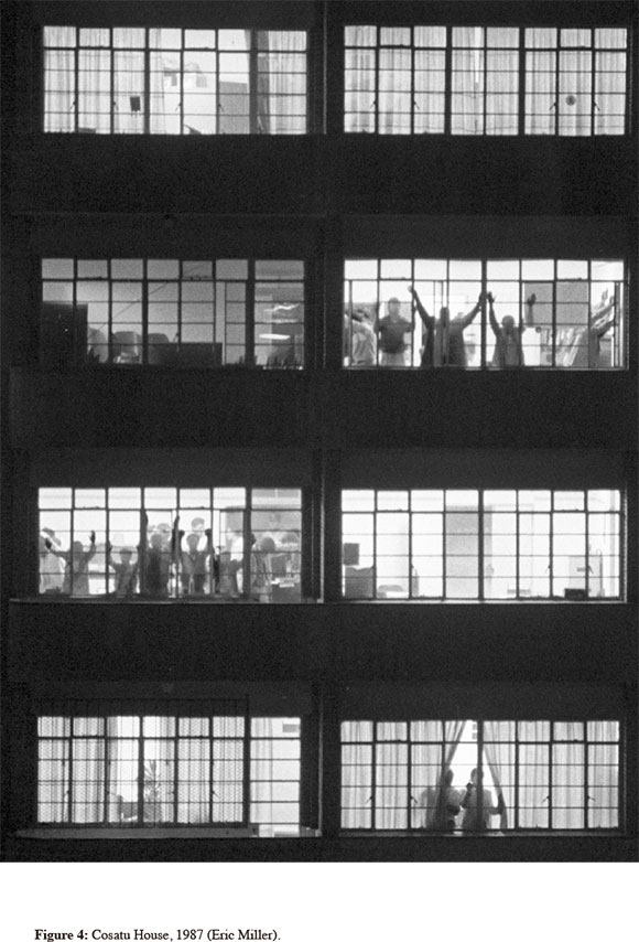 This is a very dense, modernist photograph about multiple surveillances and the dynamics around seeing, all closed in a circuit. The two figures half-concealed by the curtains drawn slightly open, cautiously looking out as if to find out what is happening above, seem to want vision but do not want to be visible. It is a code for the power problem here, the enactment of domination and surrender - all exposed against an industrial grid of architecture, in a series of frames replicating the action of the shutter. The photograph presents a series of cell-like structural vignettes that offer a series of statements about the relations between antagonists in the political struggle, including the photographer who left the scene when spotted by the policemen (Figure 4).