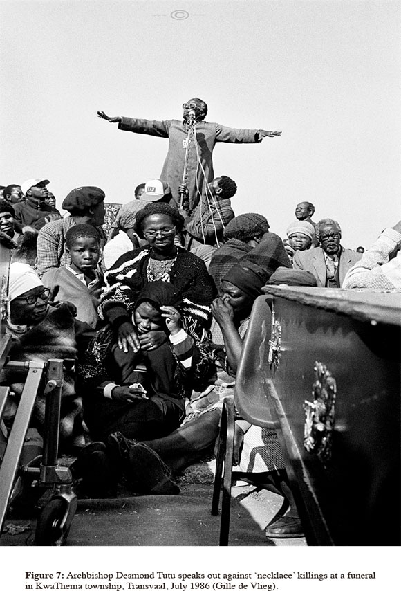 The Hector Peterson image became iconic, and it is relevant to the rest of this essay to ask why. Nzima's picture has often been compared to the Pièta. A very strong theme which emerges in South African photographic icons of the apartheid era is an ostensibly Christian one, involving martyrdom and the suffering of the innocents. The appetite of the west for similar images during the 1980s, discussed below, shows how profoundly and reductively the impact persisted globally.