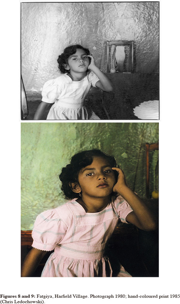 Chris Ledochowski is very insistent about what the majority of South Africans wanted from photography: '[T]hey don't see themselves in black and white looking all dismal and that.' Many younger township residents in fact associate black and white photographs with poverty. Most people, quite simply, want 'beauty'. This means colour. Ledochowski's long experience in the Cape Flats, where he encountered both a desire for hand-coloured portraits (an old photographic tradition for which the Van Kalker Studio was famous) and ephemeral popular art, made him rethink his entire photographic practice. He transformed a number of his well-known black and white photographs into entirely different works, by treating them in the same way as hand-coloured portraits. 'But you force the viewer, you force them. That's my aim, you see. Just like I did with those coloured-in things. I forced you to look at this photo that is so dismal but coloured you have to look at it in a different light, you see. It can actually be quite beautiful.'35