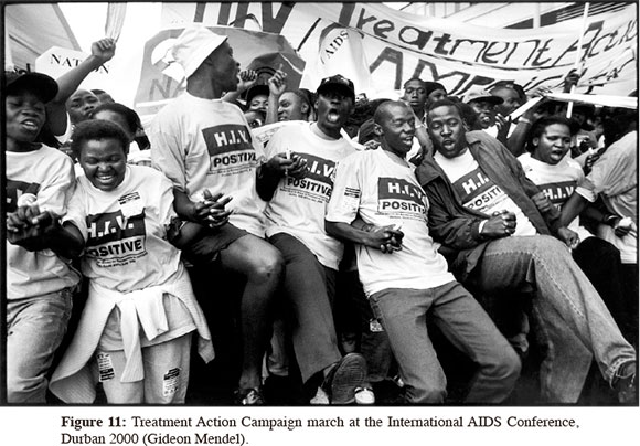 There are formal aspects to this argument. The technique and aesthetic apparent in Gideon Mendel's photograph of Treatment Action Campaign demonstrators, probably the best toyi-toyi photograph ever taken, takes a familiar genre to new levels. The protest song and dance toyi-toyi was massively photographed in the 1980s, but is incorporated here into bigger contexts of the politics of health in Africa. Visually, it is difficult to imagine any other toyi-toyi photograph which (perhaps ironically in this case) conveys such rolling, boiling movement and political force: