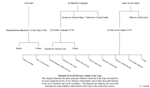 In 1719 Eksteen married his third wife, Alida van der Heijden, who was to bear him twelve children and outlive him by more than 40 years. Eksteen's relations with the Cruijwagen family did not suffer from this at all - in fact, it seems that he tended to keep the contacts he built up through his marriages and various undertakings throughout his life. Both the Cruijwagens and the Van der Heijdens played a major role in the success of Eksteen during the 1720s-30s. Thus their own networks brought in a larger circle of potential creditors and helpers, e.g. his sister-in-law Catharina Cruijwagen married Cornelis Heufke, the son of one of the major pachters of the 1720s-30s, Johannes Heufke; while in 1730 his brotherin-law Willem van der Heijden married Helena Josina Esser, the daughter of the alcohol pachter Isaac Esser.116 Most importantly, however, Johannes Cruijwagen, Eksteen's former brother-in-law, entered the meat pacht in 1728 with Eksteen as one of his sureties.117 The timing of this is not coincidental. Jan Mijndertsz Cruijwagen had died shortly before this, leaving his large estate to his two children and his surviving Eksteen grandchild.118 It may well have been this injection of cash which convinced Eksteen to join Cruijwagen and his new father-in-law, Pieter Jurgen van der Heijden, in the meat pacht. The financial security, large land and stock holdings, and the large circle of contacts and connections that these families had built up over the years, made it possible for them to control the most lucrative trade at the Cape for almost two decades.