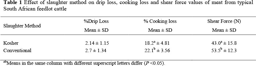 The aim of this study was to evaluate and compare the influence of conventional and Kosher slaughter methods on beef tenderness and water holding capacity in terms of drip and cooking losses. The work was necessitated by the growing consumer awareness in South Africa over the past decade regarding meat quality and animal welfare. There is also growing pressure on meat producers to comply with consumer preferences in terms of good quality meat with the best consistent eating qualities (Strydom, 1998). Poor animal welfare practices pre-slaughter or at slaughter can lead to inferior meat quality which results in loss of yield and loss of sales through rejection and downgrading of poor quality product (Gregory, 1998).