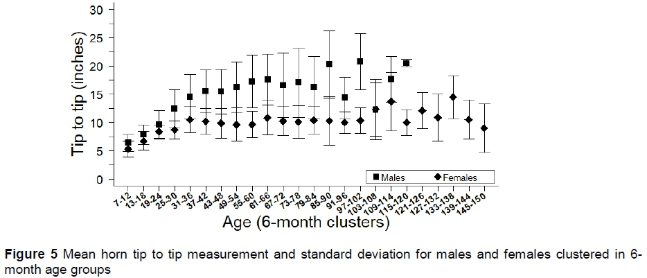 Horn circumference reaches a developmental plateau at the same age cluster (31-36 months) for both sexes (Figure 3). Similar to the horn length traits, males showed a greater development at the circumference, nearly 2.7 inches on average more than females over the study period. It is also apparent that these traits are less variable within age group than length traits.
