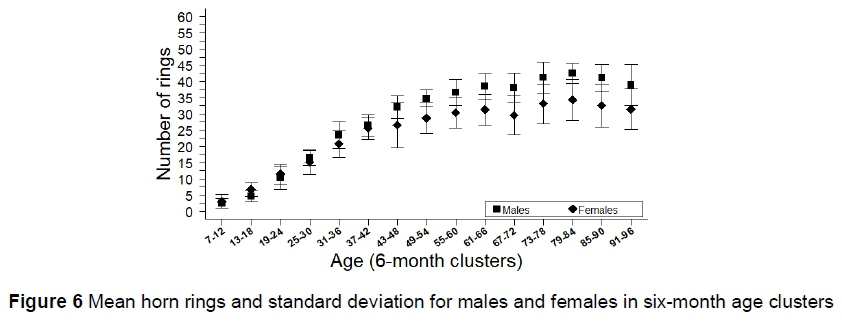 Horn rings follow a similar development pattern to horn length, but reach a plateau state at a later age (61-66 months old) (Figure 6). Little variation between sexes is observed for horn ring counts from 7 to 42 months old, while relatively large variation is seen around the means within the age clusters. An increase in the number of horn rings is seen even after the growth in horn length seemed to have ceased. In terms of the downward trend in horn tip length with age, it has been suggested that horn attrition accounts for this phenomenon and horn growth is a continuous process throughout the lifetime of the animal (Simpson, 1971; Hall, 2015). The ring count seems to reach a plateau state, but measuring techniques do not consider horn ring abrasion or sub-mature growth, often referred to as 'posts' (Figure 4). In addition, the data of the present study indicate that horn ring count is not an accurate estimation of age for sable antelope because of the variation in means in age classes for both sexes.