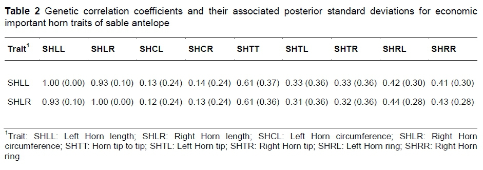 Based on the posterior standard deviations values (SD) (Table 1), most variance components (except horn length and tip to tip) were shown to be accurate for horn traits. In the present study heritability estimates for horn length and circumference were found to be very low (below 0.1), but the heritability of the horn length was not estimated accurately according to the SD. On the other hand, the tip-to-tip measurement showed a heritability estimate that was considered medium to high (0.31), while tip length was highly heritable (±0.5).