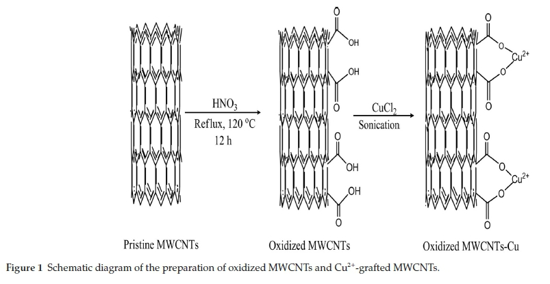 Oxidized MWCNTs (0.1 g) were added to 20 mL of a 1 X 10-3 M Cu (II) solution and dispersed by sonication for 30 min. After cooling, the ox-MWCNTs/Cu2+ were washed and filtered through a nitrocellulose filter (0.20 μm Millipore, USA). The obtained ox-MWCNTs/Cu2+ were then dried at 60 °C for 24 h (Fig. 1).