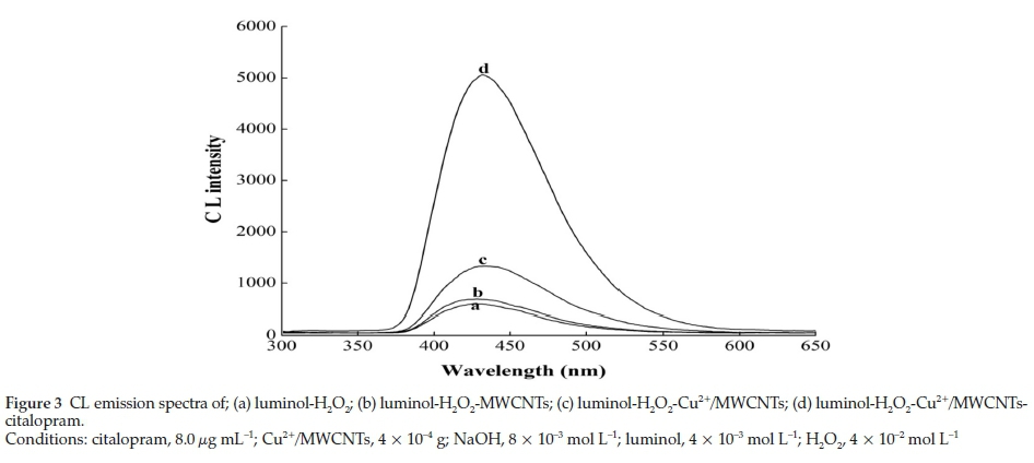 Analytical procedure consisted of adding the following quantities of equilibrated solutions to the CL reaction cell using a micropipette. Citalopram stock solution to give final concentration of 0.2-8.0 Mg mL-1,4x10-4 g ox-MWCNTs/Cu2+, 400 of NaOH solution (8 x 10-3 mol L-1), and 400 luminol (4 x 10-3 mol L-1). The kinetic-curve of the CL signal was measured at 430 nm after injecting of 400 (4 x 10-2 mol L-1)ofH2O2 into cells to initiate the CL reaction. CL intensities (AI) were calculated using AI = Is-Io, where Isand Ioare CL signals in the presence and absence of citalopram, respectively.