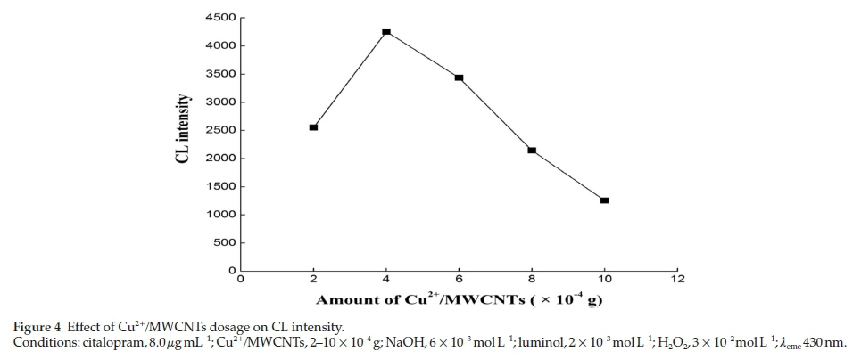 The effect of the amount of MWCNTs/Cu2+ used was investigated in the range 2-10 x 10-4 g. Maximum CL intensity of the luminol-H2O2-citalopram-MWCNTs/Cu2+ system was achieved at4x10-4 g (Fig. 4), and thus, this amount was used in further experiments. The effect of sodium hydroxide concentration on the luminol-H2O2-citalopram-MWCNTs/Cu2+ system was investigated in the range 2-12 x 10-3 mol L-1. CL intensity was found to peak at a NaOH concentration of8x10-3 mol L-1 (Fig. 5). The effect of luminol concentration on CL intensity was also studied in the range 1-6 x 10-3 mol L-1. CL intensity peaked at a luminol concentration of4x10-3 mol L-1 (Fig. 6). The effects of H2O2 concentration were examined in the range 1-6 x 10-2 mol L-1.CL intensity increased with H2O2 concentration to4x10-2 mol L-1 and then plateaued (Fig 7).