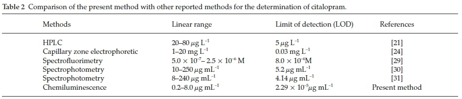 Under optimum experimental conditions, the concentration of citalopram and chemiluminescence intensity exhibited a linear relationship in the range 0.2-8.0 μg mL-1 with a correlation coefficient of 0.996-0.9977 (Fig. 8a, b). Limit of detection (LOD) was defined as the concentration of citalopram that produced a CL intensity three times the blank standard deviation (LOD = 3 Sb/m), whereas limit of quantification (LOQ) was defined as the concentration of the citalopram that produced a CL intensity ten times the blank standard deviation (LOQ = 10 Sb/m). Calculated LOD and LOQ values were 2.29 X 10-5 μg mL-1 and 7.64 X 10-5 μg mL-1 respectively. The linear regression equation, its slope, intercept, and correlation coefficient, and the relative standard deviation of the response factor are provided in Table 1. The sensitivity of the developed method is compared with other described citalopram methods in Table 2. The table shows that the sensitivity of the devised method is greater than that of any of the previously described methods.
