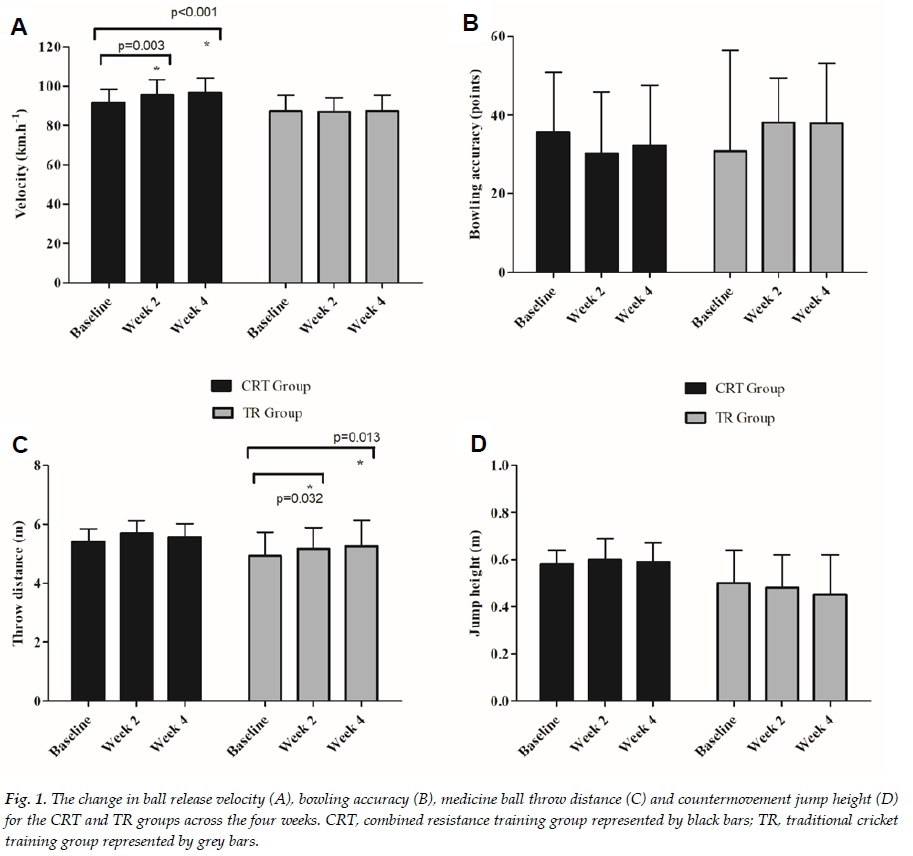 RESULTS: The CRT group significantly increased their ball release velocity by six percent (5.1 km-lr1), effect size (ES) =0.65, p<0.001) after four weeks of training, while there was no significant difference in the TR group (0.00 km-h4, ES=0.0, p=0.674). There was no statistically significant difference in the bowling accuracy and lower body neuromuscular performance for both groups and the upper body neuromuscular performance for the CRT group.